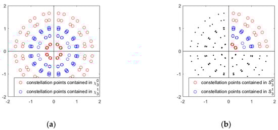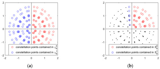 The subsets creation process of to is simpler. Since both and (i = 0, 1, …, 5) contain constellation points in the first quadrant, the subsets and can be obtained by retaining the constellation points in the first quadrant in and respectively. Taking as an example, the constellation points contained in and are shown in Figure 4a, and the constellation points contained in and are shown in Figure 4b.