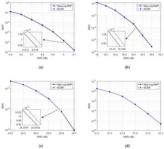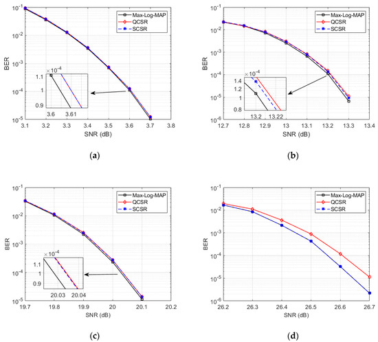 Figure 6 compares the BER performance of the Max-Log-MAP algorithm, QCSR algorithm, and SCSR algorithm over i.i.d Rayleigh channel. 2D-256NUCs are used in the simulation. Figure 6a shows the BER performance comparison when CR = 2/15. Combined with Table 1, it can be seen that the subsets of the QCSR algorithm contain all 16 constellation points. For the received symbols in a certain quadrant, although some constellation points in the subsets are redundant for LLR calculation, it can ensure that all constellation points that may have the minimum ED with the received symbol are contained in the subsets. The subsets of the SCSR algorithm remove these redundant constellation points. Therefore, the complexity of the SCSR algorithm is lower than that of the QCSR algorithm, but it can achieve the same BER performance as the QCSR algorithm. Moreover, due to the use of condensation characteristic, the performance of these two algorithms is 0.006 dB worse than that of the Max-Log-MAP algorithm. Figure 6b shows the BER performance comparison when CR = 6/15. As described in Section 1, the subsets of the QCSR algorithm are determined based on statistical results, which contain some redundant constellation points, and some constellation points that may have the minimum ED with the received symbol are lost. Therefore, the QCSR algorithm has the worst performance. The subsets of the SCSR algorithm contain all constellation points that may have the minimum ED with the received symbol, so its performance is 0.004 dB better than that of the QCSR algorithm. Then, due to the use of condensation characteristic, the performance of the SCSR algorithm is 0.009 dB worse than that of the Max-Log-MAP algorithm. Figure 6c shows the BER performance comparison when CR = 10/15. For the QCSR algorithm, although some constellation points in its subsets are redundant, the subsets still contain all constellation points that may have the minimum ED with the received symbol. Therefore, the performance of the QCSR algorithm and the SCSR algorithm are the same. Due to the use of condensation characteristic, the performance of these two algorithms is 0.006 dB worse than that of the Max-Log-MAP algorithm. Figure 6d shows the BER performance comparison when CR = 13/15. Since the condensation characteristic cannot be used, the SCSR algorithm has the same performance as the Max-Log-MAP algorithm. And some constellation points that may have the minimum ED with the received symbol are lost in the subsets of the QCSR algorithm, so the QCSR algorithm has the worst performance. The performance of the SCSR algorithm is 0.05 dB better than that of the QCSR algorithm.