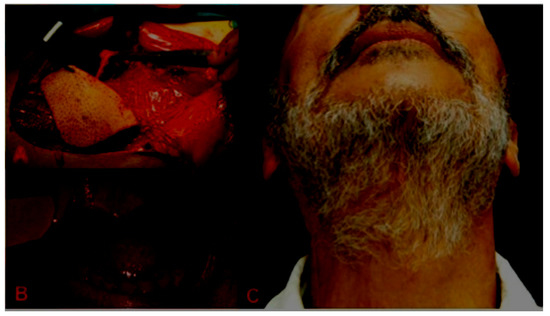 Case 1: (A) Intraoperative view of the ALT flap; (B) post-operative intraoral view (Free From Disease (FFD), 5 years after surgery); (C) post-operative axial view of the patient showing no scars on the chin and lip.