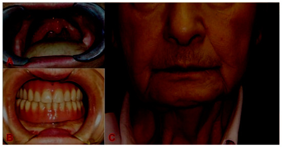 Case 2: (A) Post-operative intraoral view; (B) post-operative intraoral view (FFD, 5 years after surgery and adjuvant chemo-radiation therapy) with dental prosthesis retained using four titanium implants; (C) post-operative frontal view of the patient showing no scars on the chin and lip.