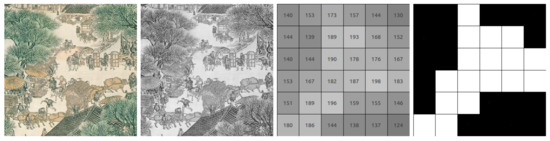 An example of the ArPico marker conversion for pictorial objects is shown in Figure 4. ArPico are always displayed with a black frame (Figure 1b). This black frame should be cropped off from the picture before the marker identification (the upper-left picture on Figure 4). Then convert the inner picture to greyscale (the upper-right picture on Figure 4), and divide it into blocks. In each block, we use the average of grey value as its feature, thus an average grey block matrix is created (the lower-left picture on Figure 4). The median of the matrix is set as the threshold to define each block as 0 or 1 (black or white). In this way, an ArPico pictorial object is converted to a 2D code pattern (the lower-right picture on Figure 4) just like an ArUco marker (Figure 1c).