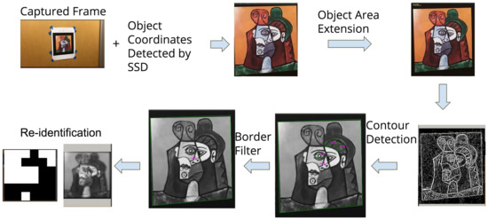 Figure 8 shows the flow of corner points extraction. After a potential region of target picture is detected using SSD, its region size will be enlarged to make sure it can include the picture as much as possible. If the object is too big, it may be reduced in size in order to improve the processing efficiency. We can convert a picture to become smaller as long as it has enough details for pose calculation. Once the optimal bounding box is generated, the exact contours of the picutre will be detected.