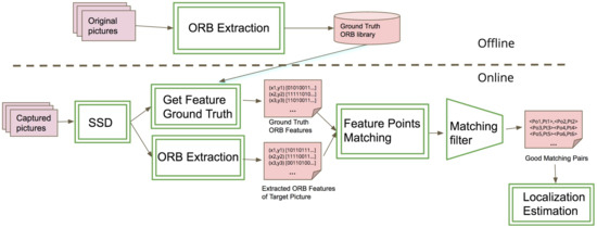 The object library building stage is the offline preparation process for the localization support. The VBL system scans all object pictures captured by cameras from different positions and angles, and generates the object feature libraries to be used for object detection. There are two main object learning components, object feature learning and object positional point extraction. The features on the planar surface of each object used for detection are learned from object picture collections. In addition, to calculate the pose of a recognized object, we also need to identify certain pixel points on the object picture to match and compare with their relative positions in the original object picture. The object positional point extraction part is used to find the positional points that not only have a unique feature but also can be used for mapping from a 2D picture surface to its 3D model. For instance, the positional points of a rectangular picture are its four corner points of the rectangle, and for other shapes, either some corner points on the picture or special ORB feature points on opposite sides of the surface.