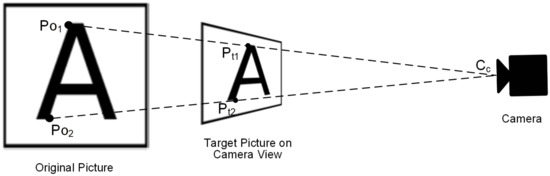 The goal of RPP is to calculate the 6 DoF(Degrees of Freedom) of a camera’s pose. There are 2 kinds of pose information in 6DoF, translation and rotation. Each of them contains 3DoF parameters. RPP can generate two vector, translation vector T and rotation vector R, using the homography matrix and the parameters of the camera.The pose projection is shown in Figure 12. The original picture model is on the left side, is the original feature point represented in scene coordinate system. The target picture on camera view is between original picture and camera. is ’s corresponding matching point on target picture, which is represented in camera reference system. is the center point of the camera, and it is also the origin in the camera reference system. The projection between and can be defined by: