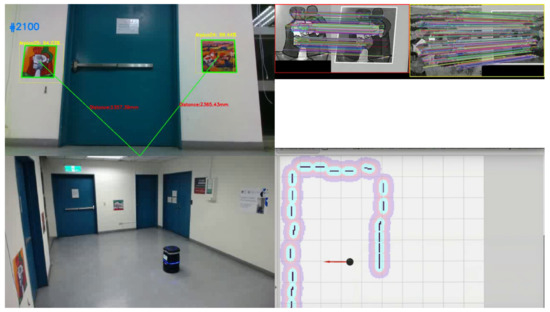 As shown in Figure 13, we have built a moving robot to test the localization accuracy. The performance study was conducted in a 3.5 × 3.5 m indoor space with 5 pre-trained pictures hanging on the surrounding walls. The top-left window shows the robot-top camera view in which the yellow boxes are the outputs from the SSD object detection and green boxes are produced by PicPose used for the robot’s pose calculation from each pictorial object. The top-right window shows the picture matching results for each pictorial object: the left side of each matching pair is the original picture in the library and the detected picture from the robot view is on the right; each line between two picture objects connects the matched feature points. The bottom-left window shows the third-party view where the robot is facing the left wall. The bottom-right window shows the robot location and viewing direction on the 3D map (ceiling view).