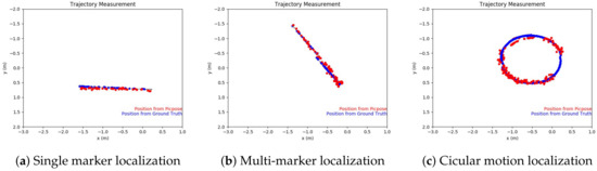 The robot is programmed to cruise on a specific route and report the localization outputs to be compared with the ground truth locations. Comparisons on some cruising tests are shown in Figure 14. The blue dots on the figures show the ground truth locations and the red dots are the locations reported by the robot using PicPose. Only one picture marker is seen by the camera in Figure 14a and its MAE is 0.063 m. In Figure 14b, the robot moves from top-left to bottom-right and can see several picture markers. As a result, the MAE is improved to 0.054 m. In general, with the increasing distance to pictures, the errors become bigger since feature points are more difficult to identify with smaller pictures on the camera view. In Figure 14c, the robot moves in a circular route. Estimating the robot location when the robot is making turns presents a challenge since the camera view is often distorted by the constantly changing angles. In Figure 14c, the reported locations are not as close to the ground truth with an MAE of 0.073. On certain part of the route, no picture marker can be seen so that no location is reported.