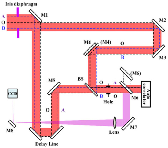 As Figure 1 shows, the pulse under investigation is size limited by the iris diaphragm firstly, and then equally divided into two pulse beams by M1. These two equal-sized pulse beams are injected into the two arms of the Michelson interferometer respectively, and finally spatially overlapped after the BS by linearly translating M4. In addition, the two pulse fronts of the overlapped pulse are completely separated by adjusting the delay line. Based on the above description, the pulse front of the overlapped pulse can be described as in Figure 2. As we know, the lens’s induced PFD is symmetrical, even though the pulse has divergence. Therefore, the delay times between the pulse front at the center (O) and the two edges (A/B) are the same; i.e., ∆T1 = ∆T2. Then the maximal PFD of each sampled pulse can be illustrated as Equation (1).