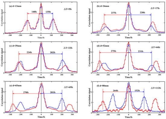 The PFD measurement was performed after the compressor. Limited by the aperture of the output window in the vacuum compressor, the beam diameter of output pulse was decreased from 85 to 80 mm. The diameter of the iris diaphragm is designed to change through 13, 26, 39, 52, 65 and 80 mm, respectively. In the case of a different beam diameter, the spatial overlap of the two pulse beams after BS is realized by linearly translating M4. The recorded correlation signals of the above six sampled pulses are shown in Figure 3, and the blue and red traces represent the results measured at two edges of the overlapped pulse after BS. The temporal intervals between the red auto- and cross-correlation peaks were 140, 237, 224, 275, 270 and 264 fs, corresponding to the time delays of T2 measured at OA. The temporal intervals between the blue ones were 135, 220, 202, 231, 201 and 152 fs, corresponding to the time delays of T1 measured at BO. As a result, the corresponding difference values (T2 − T1) of above six sampled pulses were 5, 17, 22, 44, 69 and 112 fs, respectively.