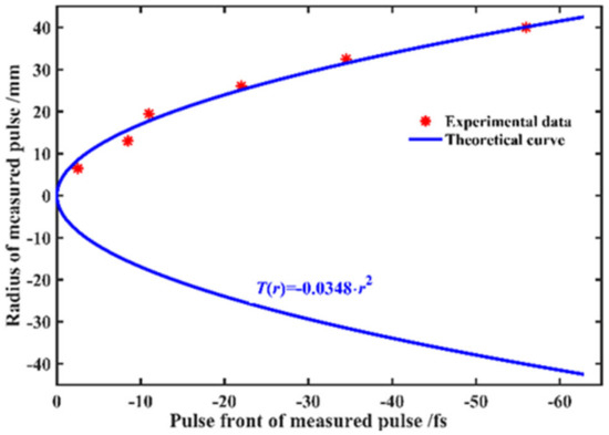 Based on the Equation (1), the maximal PFD of the above six sampled pulses are 2.5, 8.5, 11, 22, 34.5 and 56 fs, respectively. In other words, the PFD values of 85 mm-diameter compressed pulse are −2.5, −8.5, −11, −22, −34.5 and −56 fs respectively, at the radii are 6.5, 13, 19.5, 26, 32.5 and 40 mm. As Figure 4 shows, the experimentally measured results fit well with the theoretical curve. The slight difference may have resulted from the little divergence (≈50 μrad) of the pulse beam; the maximal group delay of the pulse front induced by this divergence is below 2 fs. Based on the experimental results and theoretical calculations above, we can deduce the maximal PFD of an 85 mm-diameter compressed pulse is about −62.8 fs. In addition, the experimental results also demonstrate that, by this improved self-reference cross correlator, the PFD at any position of pulse can be directly measured; meanwhile, the global PFD can be obtained by the scanning measurement.