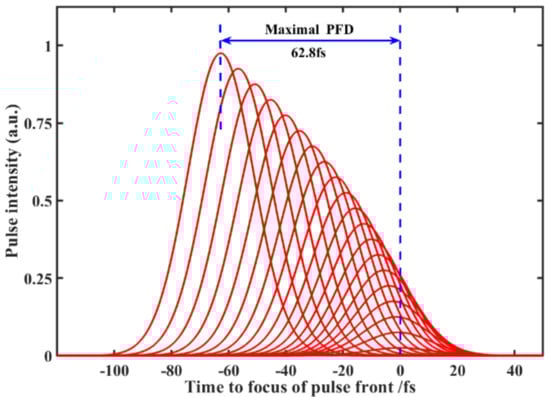 As described in [24], the PFD in a 200 TW/27 fs laser system mainly results from the four-stage lens-based beam expanders. The gratings-induced pulse front tilt has been carefully checked and controlled by the method referred to in [28]. Thus, the PFD in this laser system can be illustrated as Equation (2).