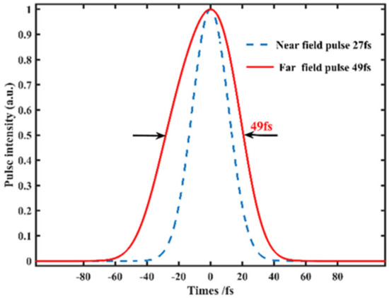 As a result, the temporal profile of the pulse at focus is an envelope of superposed pulses from different radial positions, and the effective pulse duration at the far field is simulated to be ≈49 fs (N→∞), which is almost two times the generally regarded 27 fs, as shown in Figure 6. Consequently, the actually achieved focused intensity of this laser was only about 55% of the ideal value (without PFD). In general, the influence of PFD is small for ns-class long lasers, and therefore can be ignored. However, for high-peak-power femtosecond lasers, PFD can result in significant temporal broadening of pulse duration at focus, and then dramatically reduce the focused intensity. For example, the PFD in PEAT laser [18] induced a decrease of the focused intensity on the target by a factor of eight compared with the ideal situation. Therefore, in order to achieve higher focused intensity and further promote strong field laser physics investigations, the PFD in high-peak-power femtosecond laser systems should be compensated based on the experimentally measured results [15,16,18,29].