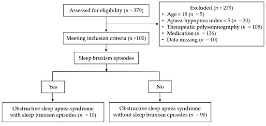 Of the 379 subjects who underwent in-laboratory PSG, the data for 100 who met the above criteria were analyzed. The data were divided into groups of patients with and without SB episodes (Figure 1).