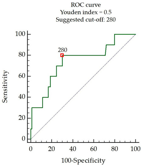 There were significant differences in the following factors between the patients with and without SB episodes: total sleep time, the percentage of stage N2 sleep in the total sleep time, sleep time in a nonsupine or supine position, AHI, the AHI of NREM sleep, the AHI in a nonsupine position, the AHI in a supine position, and mean oxygen saturation (Table 2). The total sleep time in patients with SB episodes was longer than in those without. Stage N2 sleep in patients with SB episodes occupied a larger percentage of the total sleep time than in those without. Sleep time in the supine position in patients with SB episodes was longer than in those without. In contrast, sleep time in the nonsupine position in patients with SB episodes was shorter than in those without. The AHI in patients with SB episodes, regardless of sleep position, was lower than in those without SB episodes. The AHI during NREM sleep in patients with SB episodes was lower than in those without. The mean oxygen saturation level in patients with SB episodes was higher than in those without. Of these significant PSG indices, sleep time in the supine position remained a statistically significant variable in the multivariate analysis (Table 3). The cut-off point for sleep time in the supine position was determined based on a receiver operating characteristic curve (Figure 2). According to this analysis, the cut-off point was set at a sleep time in the supine position of 280 min, which indicated SB episodes with a sensitivity and specificity of 80.0% (95% CI, 44.4–97.5%) and 70.0% (95% CI, 59.4–79.2%), respectively, giving a predictive accuracy of 0.745 (95% CI, 0.648–0.827; p < 0.01). The positive and negative likelihood ratios were 2.67 and 0.29, respectively. Sleep efficiency, sleep onset latency, the percentages of stages N1, N3, or REM sleep in the total sleep time, AI, AHI during REM sleep, the lowest oxygen saturation level, the mean oxygen desaturation level, and the sound intensity of snoring were not significantly different between the patients with and without SB episodes (Table 2).