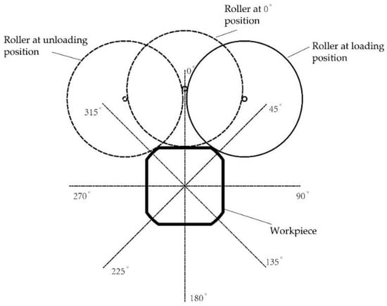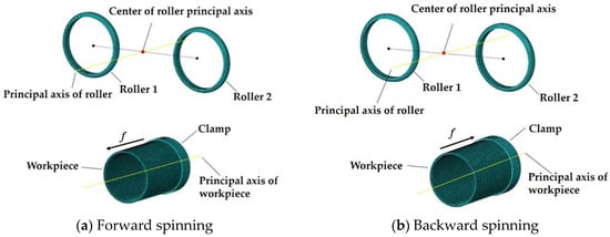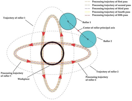 During the process, the two rollers spun with multiple passes, and the principal axis of the roller was fed in the radial direction after every pass, as shown in Figure 3. The processing trajectories of the two rollers show how the workpiece was gradually transformed from a tube into a quadrilateral part via the continuous radial feed with each pass.
