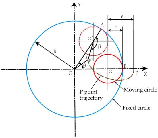 In mathematics, the hypocycloid can be defined as follows: when a moving circle is inscribed on a fixed circle and rolls along the fixed circle without sliding, the trajectory of any point on the moving circle is a hypocycloid [,]. If the roller is regarded as a mass point and set as point P, then the trajectory of the roller can be derived by setting the radius of the fixed circle as R, the radius of the moving circle as r, P as a point fixed on the moving circle and the distance from P to the center of the moving circle as e. As shown in Figure 2, the center of the fixed circle is O, the center of the moving circle is C, the unit vector of the X axis is and the unit vector of the Y axis is . Initially, point P coincides with the X axis. Upon rotation, the contact point of the fixed circle and the moving circle is A, the center of the circle C becomes and point P moves to . Then, must be at the radius OA of the fixed circle. The following expressions can be defined: