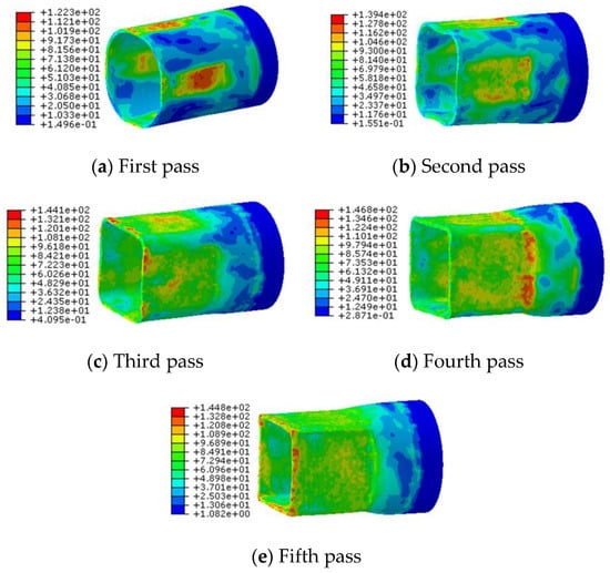 Cross-sectional distribution of equivalent von Mises stress for each pass of the non-circular spinning process.