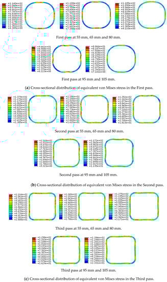 3.1.2. Cross-Section Distribution of Equivalent von Mises Stress after Each Pass
