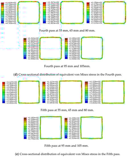 Figure 6 illustrates the distribution of equivalent von Mises stress in the cross-sectional area of the workpiece at a distance of 55 mm, 65 mm, 80 mm, 95 mm and 105 mm from the fixed end after each pass. After the second, third, fourth and fifth passes, the equivalent von Mises stresses of the workpiece were larger in the area of the workpiece gradually loaded by the roller and the area immediately before the roller unloading position. As the roller gradually loaded the workpiece, tensile stress was generated between the roller and the undeformed area in the material at an angle of 45°, as shown in Figure 4. Before the workpiece was unloaded, pressure existed between the roller and the undeformed area at an angle of 315°, as shown in Figure 4.