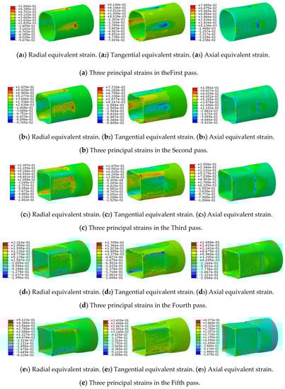 Figure 8 shows the distribution of the three principal strains in the workpiece for each pass. The radial tensile strains in the first, second and third passes were larger in the area where the forward pass began. Tensile strain was generated because of the clamp constraint and the radial feed of the roller in the area. An overall trend of radial strain can be clearly observed in the fourth and fifth passes. In the area gradually loaded by the roller, compressive strain in the workpiece was presented in the radial direction because the material in this area was compressed in the radial direction by the movement of the roller relative to the workpiece. In the area immediately before the position at which the workpiece was unloaded, tensile strain was generated in the radial direction by the movement of the roller relative to the workpiece.