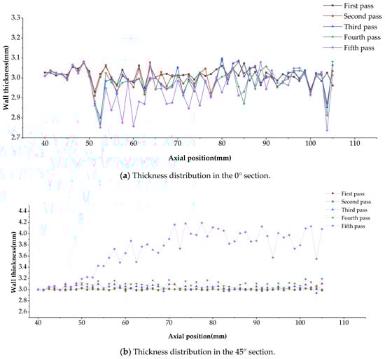 Figure 9 shows the thickness distribution of the workpiece at 0° and 45° along the axial direction. In general, thinning and thickening trends in the forward and backward passes, respectively, were not obvious in the 0° section. In the spinning process, the roller and the workpiece contacted and separated continuously, and the contact time between the workpiece and the roller was very short, which is different from conventional spinning. In conventional spinning, stable axial tension in the forward pass and stable axial pressure in the backward pass are generated, which can make workpiece thinning or thickening obvious. Meanwhile, to reduce the simulation time, the axial feed rate was set to 2 mm/r. This parameter may need to be further reduced to obtain a constant thickness distribution using the proposed method.