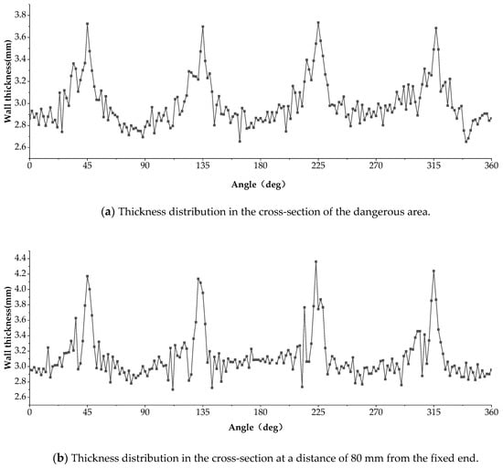 The cross-section at a distance of 80 mm away from the fixed end represents the midpoint of each pass, and the spinning conditions were relatively stable here. Figure 10b shows the wall thickness distribution along the tangential direction. The angles of 0°, 90°, 180° and 270° correspond to the center of the sidewall, and the angles of 45°, 135°, 225° and 315° correspond to the corners. The area in the center of the sidewall was thinning. However, the thickness of the wall clearly increased at the corners. The thinning rate in the 80mm cross-section was less than 10%, which was within the acceptable range.