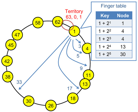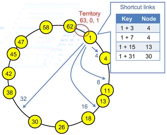 Chord [3] is a typical construction technique for ring-shaped DHTs, and also the expanded techniques have been studied [4,5,6]. In Chord, each node is assigned to the specific position on a one-dimensional key space based on hashed information such as its ID, IP address, and so on. The next node of each node on the key space is called its “successor”, and the previous node is called its “predecessor”. Each node constructs links to its successor and predecessor when the node joins the overlay network. In addition, each node manages the partial space from the predecessor to its position as a territory for data management. In Chord, moreover, each node constructs shortcut links called “finger table” to reduce the number of hops for node searching in the overlay network. The finger table consists of the links to the nodes which have additional , , ,..., bit-keys from each node while m denotes the bit length of the key space. The link for an additional bit-key corresponds to the successor. Figure 2 shows an example of the finger table when the length of the key space is bits (from 0 to 63). In Figure 2, the numbers within the circles show the nodes with their keys, and the arrows show the shortcut links of the node assigned to key 1. The upper right table shows a part of the linked nodes for each key.