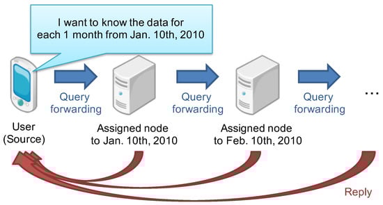 As the techniques to realize high scalability, overlay network construction techniques have been proposed such as distributed hash tables (DHTs), skip graphs, and geographical-based ones [3,4,5,6,7,8,9,10,11,12,13,14,15,16,17,18,19,20]. Those techniques construct logical networks among nodes based on the specific information of each node such as a one-dimensional ID and multi-dimensional attribute values. Nodes are discovered by sending queries with the specific value or range called “key”. Each node forwards the queries to the destination node based on its own routing table. In addition, the existing techniques assign territories to the nodes for distributed management and search of sensor data. On the other hand, the actual users and systems are expected to request sensor data with the specific time intervals such as “I want to know the data for each one month from the specific day”, “I want to show the data in the same day of week”. In addition, the specified time intervals are expected to have several patterns at the same time. Figure 1 shows the example of such queries as sensor data collection. In this paper, we call those queries “interval queries”.