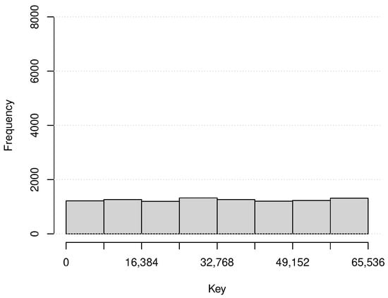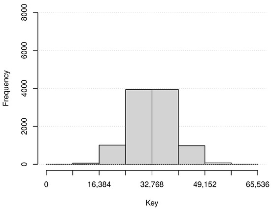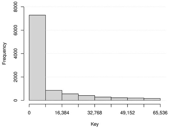 where , and it indicates that the numbers of the assigned data to each physical node, , are more similar if it is closer to 1. When , = … =. The number of the assigned data are 10,000, and those assigned keys are determined based on three patterns, random, Gaussian, and Zipf’s. The first pattern is determined at random within all of the key space. The Gaussian pattern is determined based on Gaussian distribution whose mean is the center of the key space (32,768) and the standard deviation is 65,536/10. The Zipf’s pattern is determined based on Zipf’s law (Zipf distribution) [23,24]. Figure 6, Figure 7 and Figure 8 show examples of each data key distribution, respectively. In addition, the simulation measures the number of messages among virtual nodes as communication loads to process interval queries. The sent query is only one, but it contains 52 keys from the random point and forwarded them to those assigned nodes while those intervals are 168 h (the total length is 8736 h = 52 weeks). The author executes the simulation 20 times for each environment and calculates the average of the measured values.
