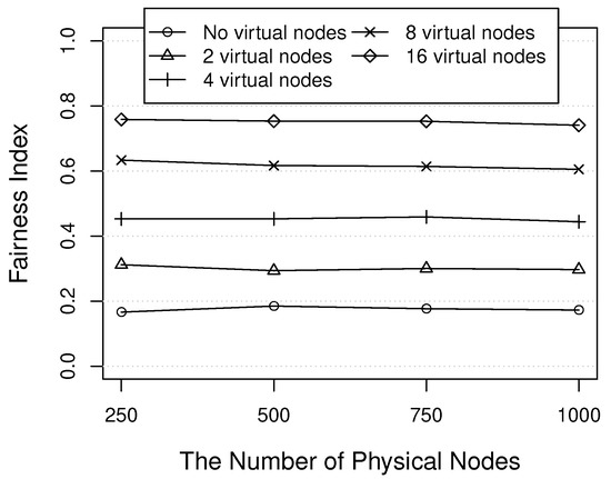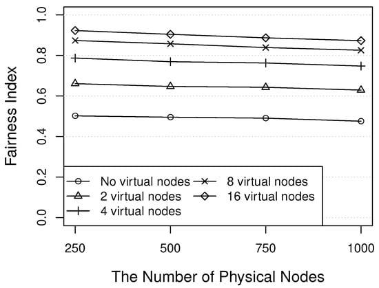First, this simulation measures the fairness index () of the number of the assigned data among physical nodes. The fairness index is calculated by the following: