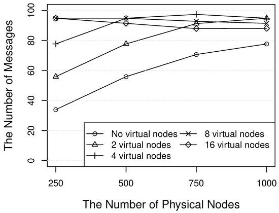 Table 2 shows the simulation environment. In the simulation environment, the minimum unit of the key space is an hour, and the length of the key space is 16 bits ( = 65,536 h). The number of physical nodes is from 250 to 1000, and all the physical nodes run the same number of virtual nodes from to . Each virtual node is assigned to the specific key at random and constructs shortcut links to other virtual nodes based on the method described in [21]. In this paper, the author compares the proposed method to the case of no virtual nodes (or each physical node runs only one virtual node) because the proposed scheme aims to highly distribute the loads of physical nodes by node virtualization.