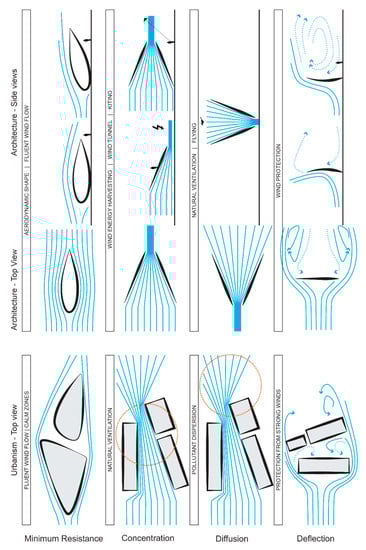 Therefore, the designs incorporating the wind can be aimed at different goals, depending on what kind of wind-architecture interaction is beneficial for the specific site: natural ventilation, pollutant dispersion, aerodynamic designs, pedestrian wind comfort, and wind energy harvesting (Figure 2).
