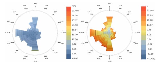 Left: the colors represent the wind speed, the numbers next to the wind directions represent the percentage of time per year. Right: the colors represent the wind temperature (source of data: EnergyPlus [37]).