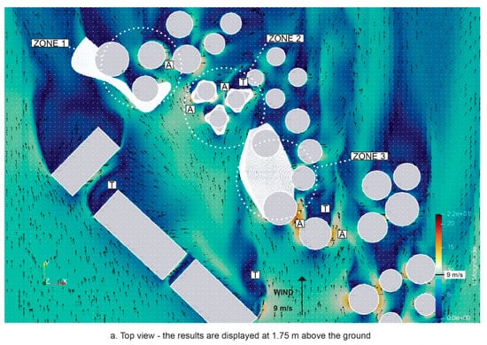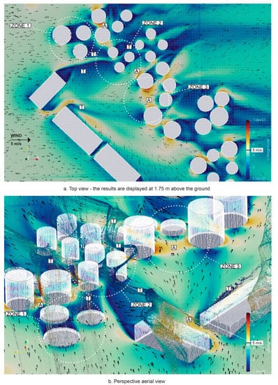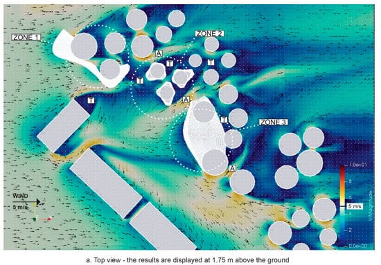 The westerly winds simulation converged in 495 iterations, and the southerly winds simulation in 388 iterations. In Figure 6 and Figure 7, the wind analysis results, post-processed in Paraview, are displayed at a horizontal plane, 1.75 m above the ground. Accelerated wind flow (A), as well as turbulent flow (T), are highlighted. The accelerated wind flow, as well as turbulent wakes, are not desirable in zones 1 and 3; however, with suitable architectural interventions, the wind comfort can be provided (employing the windbreak), or the turbulence can be reduced (with a fluid architecture). Venturi effect (acceleration of the flow, passing through a restriction) is favored in zone 2 and utilized for harvesting the wind energy.