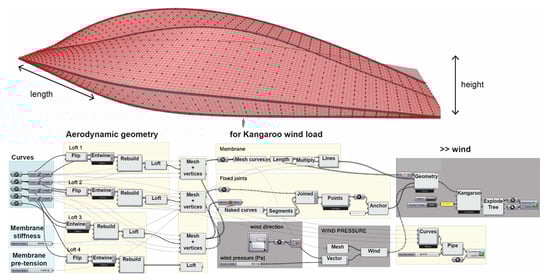 Modeled parametrically, height h, and the lift angle α (an inclination towards the wind flow) of the wind-shielding membrane can be altered, with the height constrained between 3 and 9 m. Together with another parametric variable, a contour curve, the final shape is defined (Figure 9).