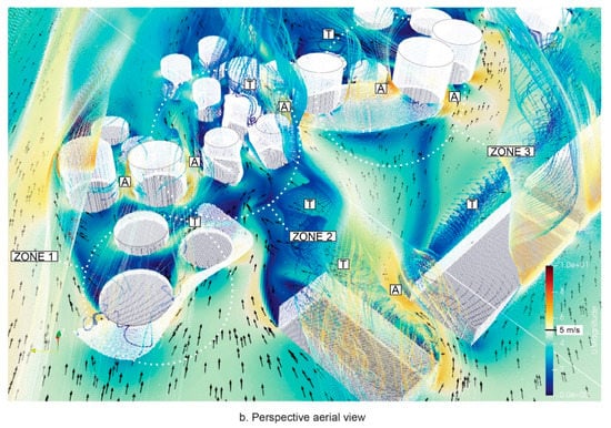 Southerly winds with the inlet wind speed 9 m/s through the area of interest. The designed architectural forms deflect the wind from the baths in zone 1, accelerate the flow for wind energy harvesting in zone 2, and reduce the turbulent flow in zone 3.
