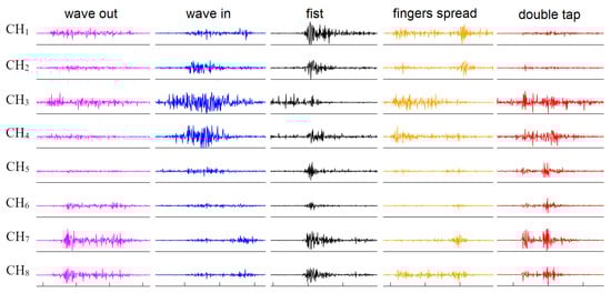 As we mentioned before, an EMG sensor measures the electrical signals when a voluntary movement is produced due to the contraction of skeletal muscles. This contraction is produced by the activation of a set of muscle fibers, called a motor unit (MU), where each fiber of the MU is connected to the axon of a motor neuron. The force produced by a muscle depends on the number of MUs activated by the brain. MUs contract when a train of electrical pulses, generated by the brain, reaches each of its fibers. This train of pulses that reach a MU is called Motor Unit Action Potential Train (MUAPT). The superposition (i.e., linear summation) of the MUAPTs of several motor units is what we call an EMG. Additionally, an EMG contains not only MUAPTs but also Gaussian noise [23] due to signals generated by nearby organs, environment noise, or noise produced by the electrical equipment used to measure the EMG. It is important to highlight that an EMG signal behaves as a non-stationary process because the distribution of these signals change with time. The statistics of an EMG depend on several factors such as the location of the sensor, corporal temperature, and body fatness [24]. Consequently, defining a mathematical model to characterize an EMG signal is a difficult task. In Figure 1, we show an example of EMGs measured by the Myo armband for each of the five gestures recognized in this work: , , , , and . These five gestures are the ones recognized by the proprietary system of the Myo armband, a sensor that returns EMGs composed of eight channels measured at 200 Hz. It is worth mentioning that, in other works, some authors used sensors with EMGs sampling rates from 200 to 1000 Hz obtaining sundry results in their recognition systems [7]. However, the Myo armband sensor sampling rate—200 Hz—has been demonstrated to provide high-performance results in hand gesture recognition applications, which make it one of the most popular EMGs sensor in the market [7,25].