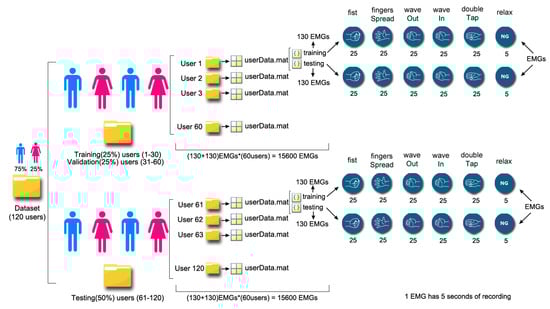 The dataset used here is composed of EMGs of 120 users which were randomly divided into two groups: training and testing. Subsequently, the EMGs of each user in each of these two groups were randomly divided into two subsets: one for training and the other for testing (see Figure 3). The training subset for each user is composed of a total of EMGs, where is a matrix that contains the i-th EMG signal recorded for 5 seconds. The label for is denoted by the categorical variable , with . In the subset , we have 25 EMGs for each of the five gestures to be recognized and five EMGs for the hand relaxed. Each of the five gestures for this work was performed following a sequence of three positions: rest, final position, and rest.