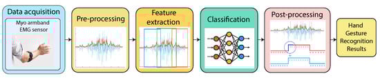 To implement our hand recognition model, five different modules are proposed: data acquisition, pre-processing, feature extraction, classification, and post-processing. The data acquisition module is in charge of gathering the signals returned by the EMG sensor. The collected EMGs are related to five hand gestures executed for 5 s each. The gestures that we use for this work are the same ones recognized by the proprietary recognition system of the Myo armband. The pre-processing module is responsible for preparing and cleaning the collected EMG data. Typical approaches used at this module include filtering [30], offset compensation [7], rectification [31], normalization [32], and segmentation [22]. The feature extraction and feature selection module allowed us to extract independent features that represent accurately each EMG to be processed. The main challenge of this module is to determine the most significant and meaningful features to be fed to the classification module. Performing feature selection is a difficult task because it is a combinatorial problem [33]. The feature extraction methods can provide time, frequency, and time-frequency features from the EMGs. Some of the feature extraction methods that can be used are the mean absolute value (MAV), root mean square (RMS), variance (VAR), standard deviation (SD), among others [13,34,35]. Once the features are selected, this information is classified in different classes using the classification module. Some of the classifiers that can be used are K-nearest neighbor [36], decision trees [37], and Artificial Neural Networks (ANN) [38]. Finally, the post-processing module consists of refining the classifier responses by smoothing or filtering spurious labels [39].
