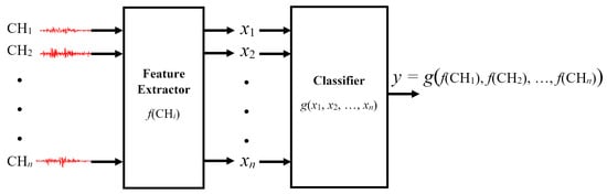 Correction of orientation is required in EMG-based hand gesture recognition systems because a rotation of the sensor causes a shift in the sequence of features fed to a classifier. This shift can cause a significant reduction of the recognition accuracy. To illustrate this problem, let us assume that we have a very simple recognition system composed of only two modules: feature extraction and classification (Figure 6). This system takes as input EMGs of channels, where each channel is denoted by , with , and returns a label y corresponding to the gesture performed. The feature extractor maps an EMG to a feature vector , where , with . The classifier g returns a label . Note that the result of the classifier depends on the sequence with which the features are arranged in the vector . If the EMG sensor is rotated, then , with and , except for rotations of degrees, thus causing a shift in the sequence of features fed to the classifier, a shift which in turn reduces the accuracy of the recognition system.