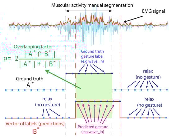 where the set is obtained from the set B by excluding from B all the pairs that contain the label . For this work, we used a threshold . It is important to note that, for evaluating the recognition, we only processed the 25 testing EMGs of each of the five gestures of interest, thus excluding the class . An illustration of the calculation of value through overlapping among ground-truth and the vector of predictions can be observed in Figure 7. At this point, it is worth emphasizing that classification and recognition are different concepts. Classification compares a predicted label with a ground true label of a given EMG sample, which allows for identifying the corresponding hand gesture class for such sample. On the other hand, recognition involves not only inferring the label of a given sample, but also requires calculating the instants of time where the gesture was performed. For this purpose, it is required to compare the vector of points related to the ground truth with the corresponding vector of predictions for a given EMG sample by using the overlapping factor .