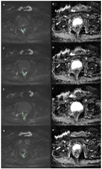 Studies have confirmed DWI utility in recurrences detection of other pelvic tumors such as prostate cancer [], and its value in the response evaluation after neoadjuvant therapy is well documented [,,,,,,]. DWI has already shown its feasibility in rectal cancer complete responders’ detection [,,,]. Molinelli et al. [] assessed if the addition of gadolinium-enhanced MRI and DWI can improve T2 sequence performance for LCR diagnosis on 43 patients. They reported that, on T2 images, the expert reader achieved an AUC of 0.92 with a sensitivity of 89%, and specificity of 76% while DWI significantly improved the AUC value to 0.999. They concluded that DWI increased diagnostic performance for LCR diagnosis compared to T2 imaging alone.