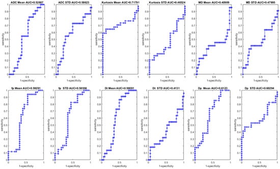ROC curves for DWI and DKI derived parameters to differentiate LCR by scar/fibrosis. Note. STD = standard deviation; ADC = Apparent Diffusion Coefficient; MD = mean of diffusion coefficient; fp = perfusion fraction; Dt = tissue pure diffusion; Dp = pseudo-diffusion.