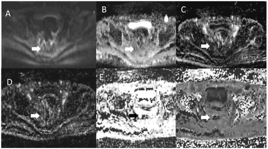 DWI measures the random Brownian water molecules motion, which is linked to cell density, cell membrane integrity, vascularity, and the viscosity of extracellular fluid [,]. These properties can be quantified by means of the individual apparent diffusion coefficient (ADC) using a mono-exponential model or by means of diffusion and perfusion tissue features using a bi-exponential model derived by Intravoxel Incoherent Motion method (IVIM). The IVIM allows the calculation of the pure tissue diffusion coefficient (Dt) that describes water motion in the cellular interstitial space, the pseudo-diffusion coefficient (Dp) that describes blood microscopic flow in the vessels, and the perfusion fraction (fp) that describes the proportion of the diffusion motion [,,,,,,,].
