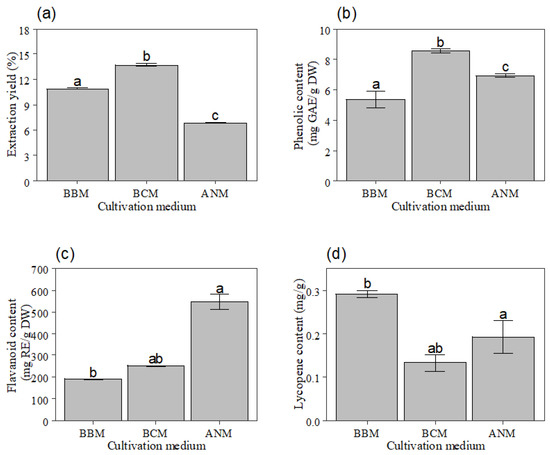 Extraction yields of the microalgae at different media are presented in Figure 1a. There was a significant dependence of C. vulgaris extraction yield on the cultivation media (F = 1577.9, df = 2, p = 0.000). Microalgae cultured in BCM had extraction yield (13.73 ± 0.121%) that was significantly higher (p < 0.0001) than in BBM (10.90 ± 0.052%) and ANM (6.87 ± 0.072%) respectively. Also, microalgae grown in BBM showed higher extraction yield compared to those raised in ANM (p < 0.000).
