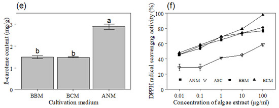 It is well-known that microalgae are one of the most important natural sources of carotenoids, which serve as sources of antioxidants and function as pro-vitamin A [48]. The beneficial effects of natural carotenoids (lutein, β-carotene, lycopene) to human and animal health have been reported from the numerous clinical and epidemiological studies in various populations [49,50]. β-carotene as a major source of vitamin A is necessary for the functions of the retina and affects many tissue types [49,50]. Besides this, it was also reported to contain anticancer, antiaging, anti-inflammatory, antibacterial and antiviral actions. Reference [51] have shown that β-carotene and lycopene inhibited the growth of human breast cancer cells due to their antioxidant activity. Furthermore, References [52] and [53] found that various in vivo and in vitro studies on the effect of lycopene in tumor cell lines have displayed the inverse relationship between lycopene intake and prostate cancer/other tumor cell growth. The finding of this study supports the view that the nutrient composition of the growth medium has an important influence on carotenoids content and composition in microalgae biomass [54]. The ß-carotene and lycopene were highest in ANM and BBM respectively, compared to other growth media. The results obtained in our study fall within the range reported by [54] who obtained carotenoids content of 0.25 ± 0.09 to 3.04 ± 0.20 (mg·g−1 DW) for Chlorella sp.