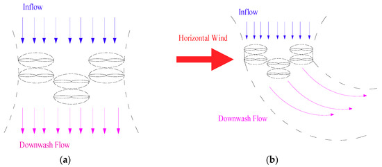 Flow model of coaxial Tri-rotor MAV in the horizontal wind: (a) No wind; (b) Horizontal wind.