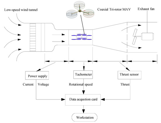 In order to obtain the performance of the MAV in the horizontal wind, wind tunnel tests were carried out to simulate the environment of MAV at 0 m/s, 2.5 m/s and 4 m/s. Experiment process of the coaxial Tri-rotor MAV considering the horizontal wind is shown in Figure 4.