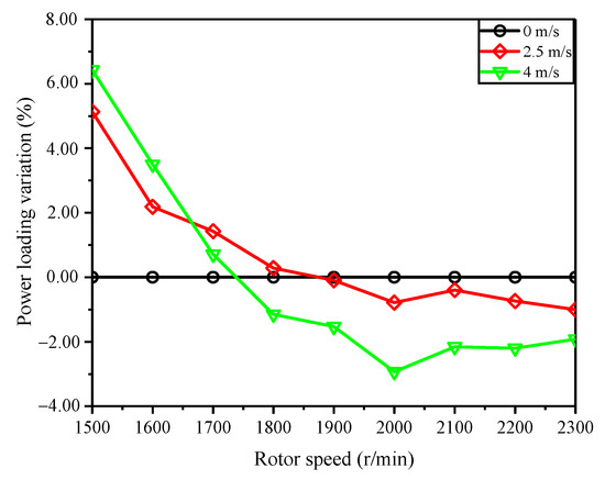 In Figure 6, it can be noted that the variation of power loading gradually decreases with the rotor speed especially for 4 m/s. Also, it can be observed that the power loading with incoming flow is greater than that of no wind effect between 1500 and 1800 r/min. In this case, the horizontal airflow will improve the aerodynamic performance of the coaxial Tri-rotors to a certain extent. However, the decreased power loading at a higher rotor speed indicated that the rotor interference is coupled with each other. At this point, the external airflow aggravates the aerodynamic interference between the rotors. For a light breeze, the coaxial Tri-rotor presented a good wind resistance. When the working speed is 2200 r/min, the power loading variation at 2.5 m/s and 4 m/s is about −0.5% and −2%, respectively.