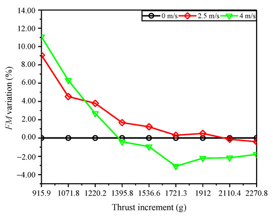 In Figure 7, it can be noted that the hover efficiency in the horizontal wind is higher at lower thrust where the power increment is relatively low. It can be seen that the intervention of the horizontal airflow can promote the aerodynamic coupling between rotors and improve the hover efficiency of the coaxial Tri-rotor. In addition, it can be observed that the hover efficiency is slightly higher when the horizontal airflow velocity at 2.5 m/s, which indicates that the hover efficiency of the coaxial Tri-rotor can be improved by the intervention of the horizontal wind.