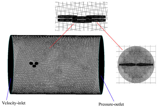 Sliding-mesh is applied to solve for the motion of the rotors due to the highly unsteady nature of flow involved in the study and the time-step size is 10e-5. The meshing distribution of the entire computing domain is shown in Figure 8.